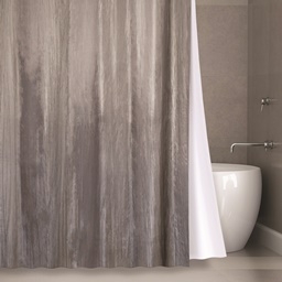 Двухслойная штора для ванны с 12 металлическими люверсами под кольца. Снаружи цветная штора из органзы, внутренняя штора - клеенка ПВХ для защиты от влаги. Цвет: сама штора серая/клеенка белая полупрозрачная.
